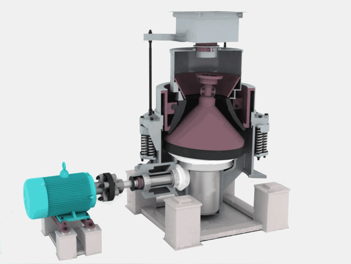 當圓錐式破碎機工作(zuò)時,電動機的旋轉通(tōng)過皮(pí)帶輪或聯軸器、 傳動軸和圓錐部在偏心套的(de)迫(pò)動下繞一固定作(zuò)旋擺運動,迫使破碎壁時而(ér)靠近時而偏離固裝在調(diào)整套上的軋白壁表麵,這樣(yàng)礦石會在破碎腔(qiāng)內受到不斷的衝擊、擠壓及彎曲作用而實現礦石的破碎。